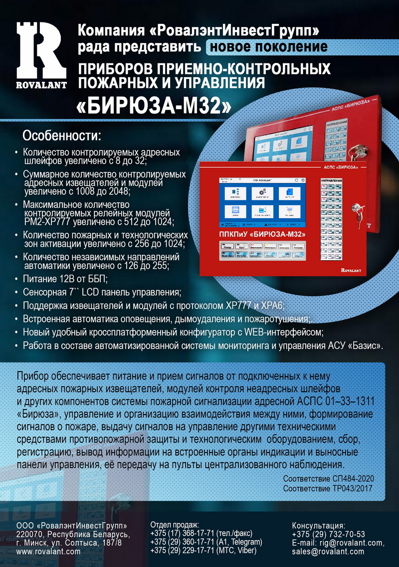 Новинка! Получен сертификат соответствия техническому регламенту ТР EAЭС 043/2017 на Прибор приемно-контрольный пожарный и управления ППКПиУ "Бирюза-М32"