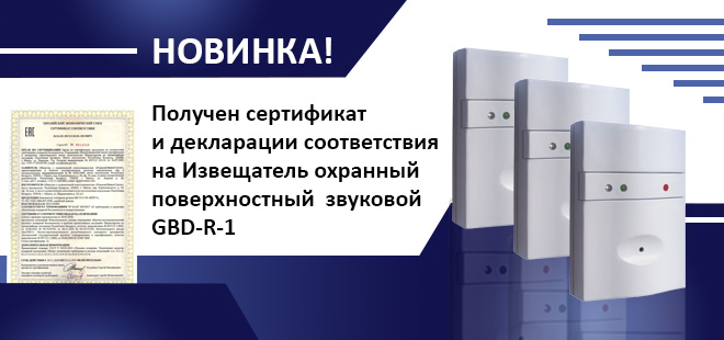 ВНИМАНИЕ! НОВИНКА! Получен сертификат и декларации соответствия на извещатель охранный поверхностный звуковой GBD-R-1 собственного производства.