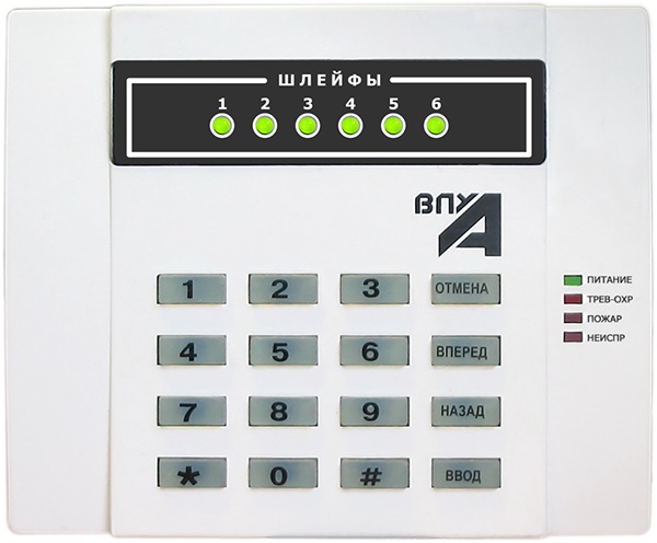 Выносная панель управления ВПУ-А предназначена для работы совместно с прибором серии «А6» и служит для отображения состояния до 6-ти шлейфов сигнализации, а так же осуществления операций постановки и снятия зон с охраны.
